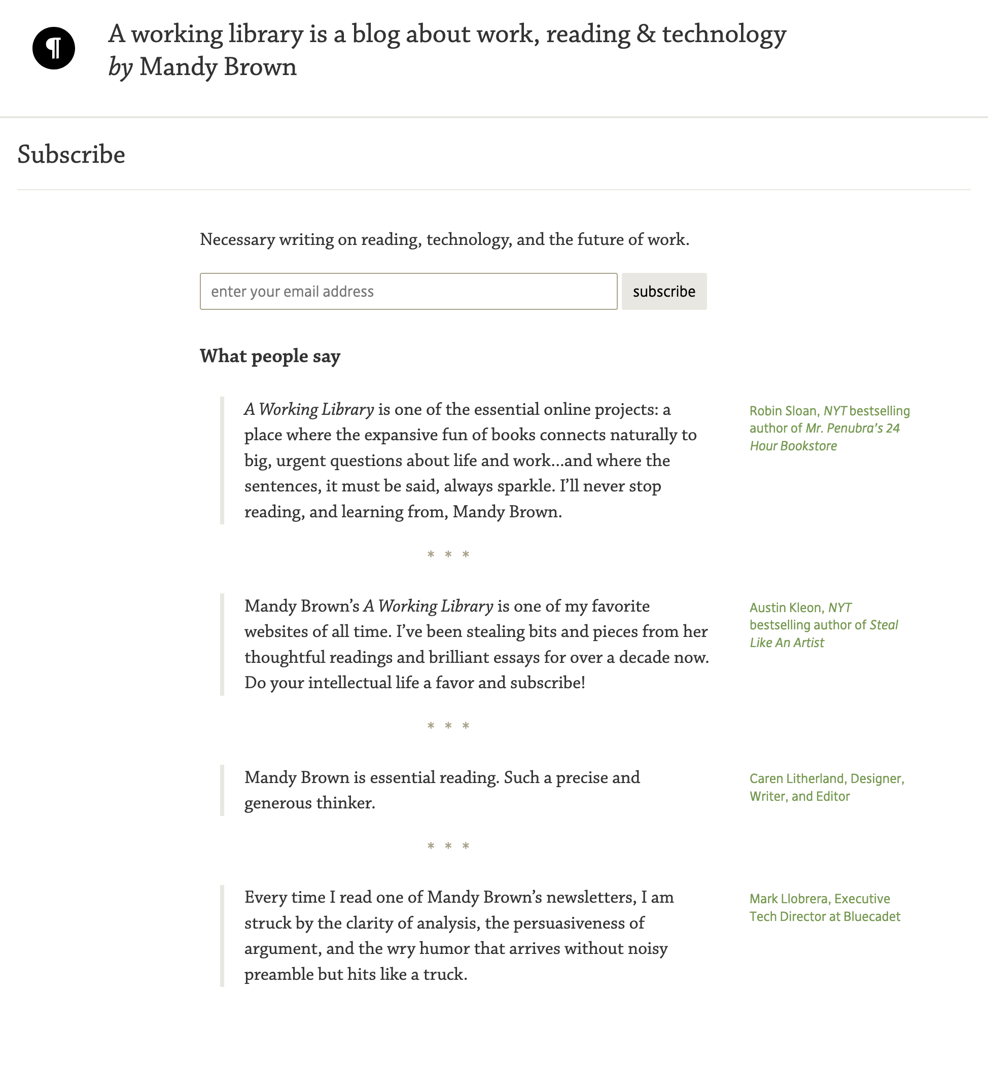 /thinking,/about, and/subscribepages at the top level navigation /thinkingseems to be a stream of links and quotes, similar to how I'm using my/linkspage./aboutis a simple about page that's wondefully written:I am a reader, writer, and work coach focused on helping people do their best work. In all my work, I read stories—whether written or spoken aloud—and seek to understand how they work, what holds them together, what they reveal about the world we live in, and where they point the way to new and better worlds.