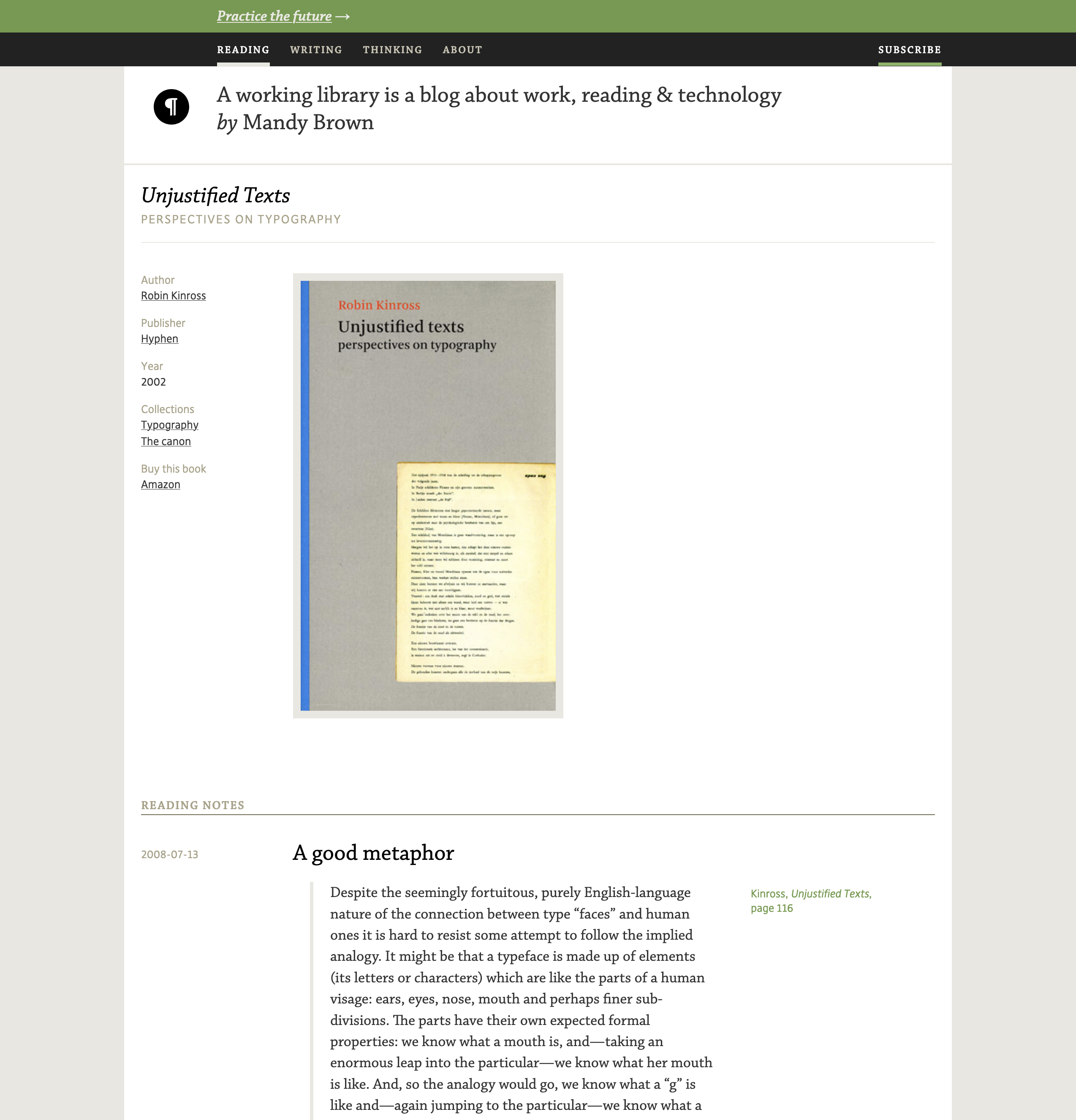 I always enjoy a good /reading or /library page. Especially the ones with notes, and thorough linkages, etc. I read one of the reading notes for this book—Unjustified Texts, Perspectives on Typography by Robin Kinross—on Mandy Brown's page.