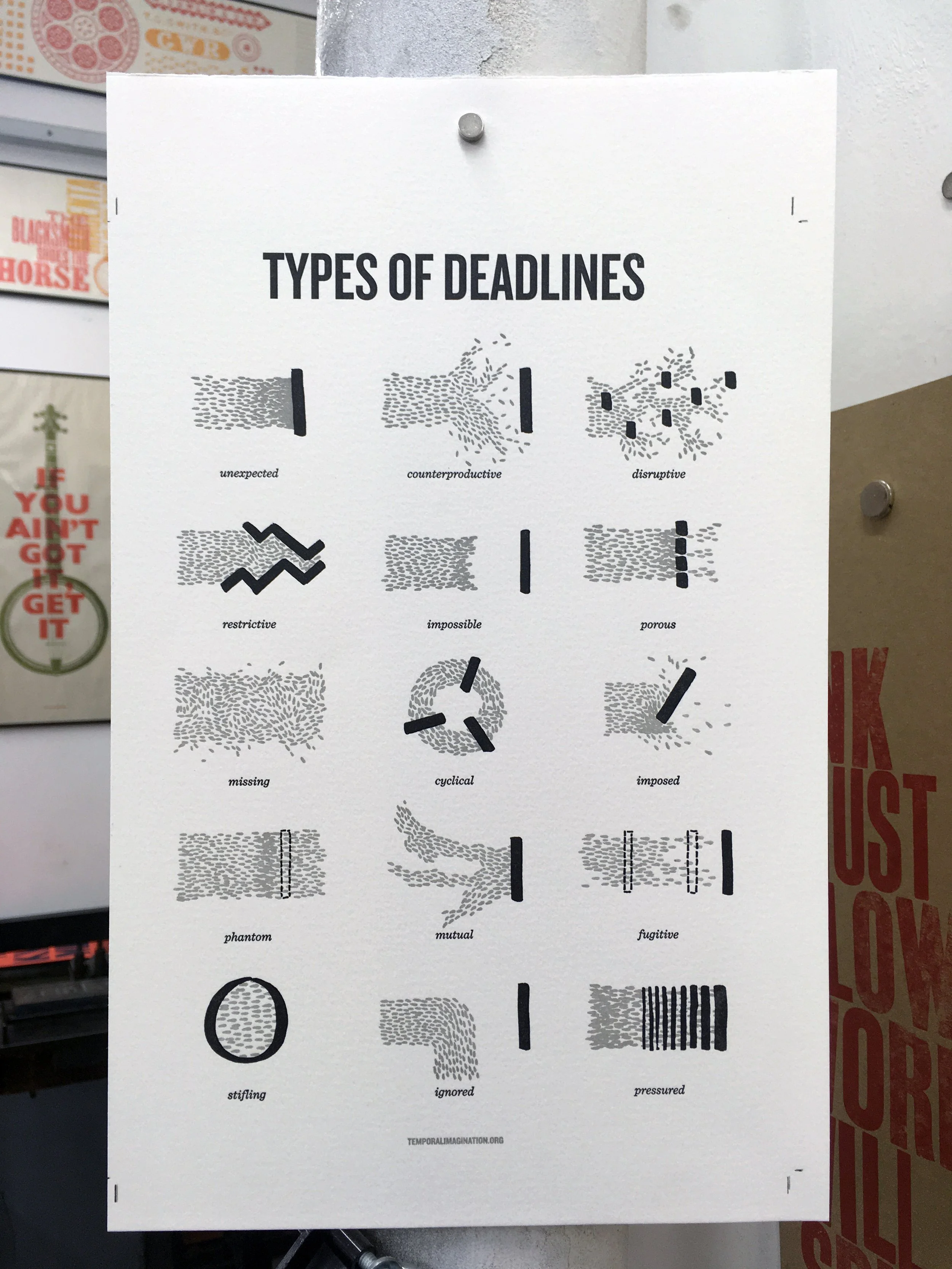 Inspired by people’s responses to the illustrations, and to the questions they help raise about people’s experiences of deadlines, we have made Types of deadlines, a poster displaying 15 different illustrations.